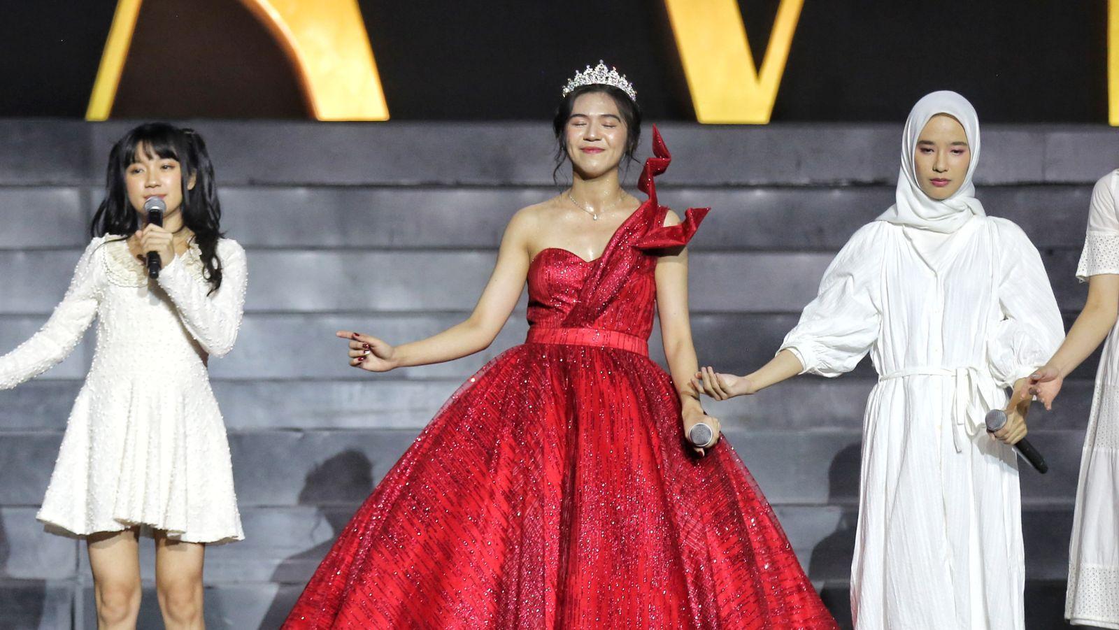 Gaby yang seorang diri menggunakan gaun merah, didampingi rekan-rekannya yang menggunakan baju serba putih.
