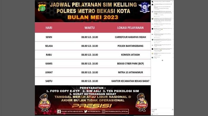SIM Keliling Bekasi Kamis 11 Mei 2023, layanan SIM Keliling Kota Bekasi diadakan tiap hari dari Senin hingga Sabtu di lokasi berbeda.