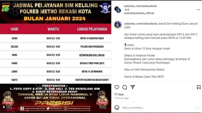 Berikut jadwal layanan SIM Keliling Kota Bekasi yang akan berlangsung pada hari Senin (8/1/2024) ini.