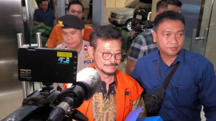 SYL hadir di Bareskrim Polri dengan mengenakan kemeja batik yang dibalut rompi tahanan KPK berwarna orange dan kedua tangannya diborgol.