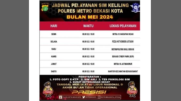 SIM Keliling Kota Bekasi Jumat 3 Mei 2024 di Mitra 10 Jatimakmur hingga pukul 10.00