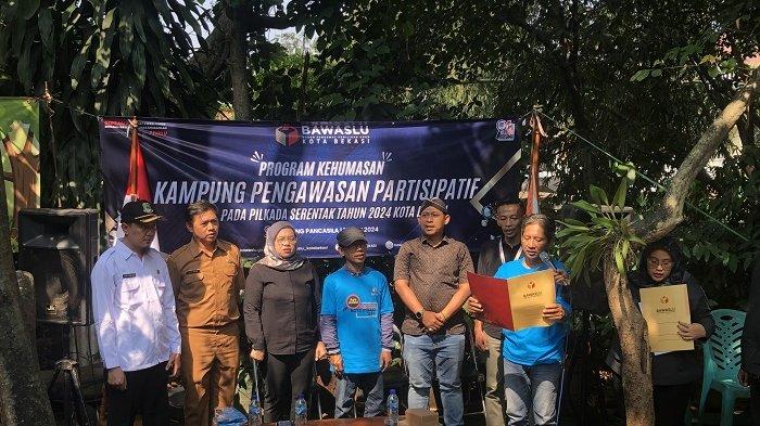 TRIBUNBEKASI.COM, PONDOK MELATI --- Badan Pengawas Pemilu (Bawaslu) Kota Bekasi secara perdana meresmikan program kolaborasi pengawasan ‘Kampung Partisipatif’ yang lokasinya berada pada kawasan Kampung Pancasila di Jalan Raya Kampung Sawah Jatimelati, Kecamatan Pondok Melati, Kota Bekasi, Senin (15/7/2024).
