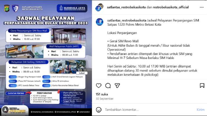 Berikut enam lokasi layanan mobil SIM Keliling bulan Oktober 2025 di Kota Bekasi: