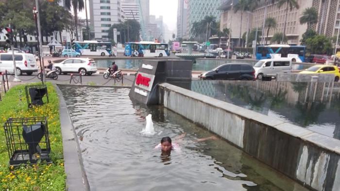 Perempuan diduga ODGJ berenang di kolam Patung Kuda Jakarta Pusat, bikin heboh warga dan viral di media sosial.